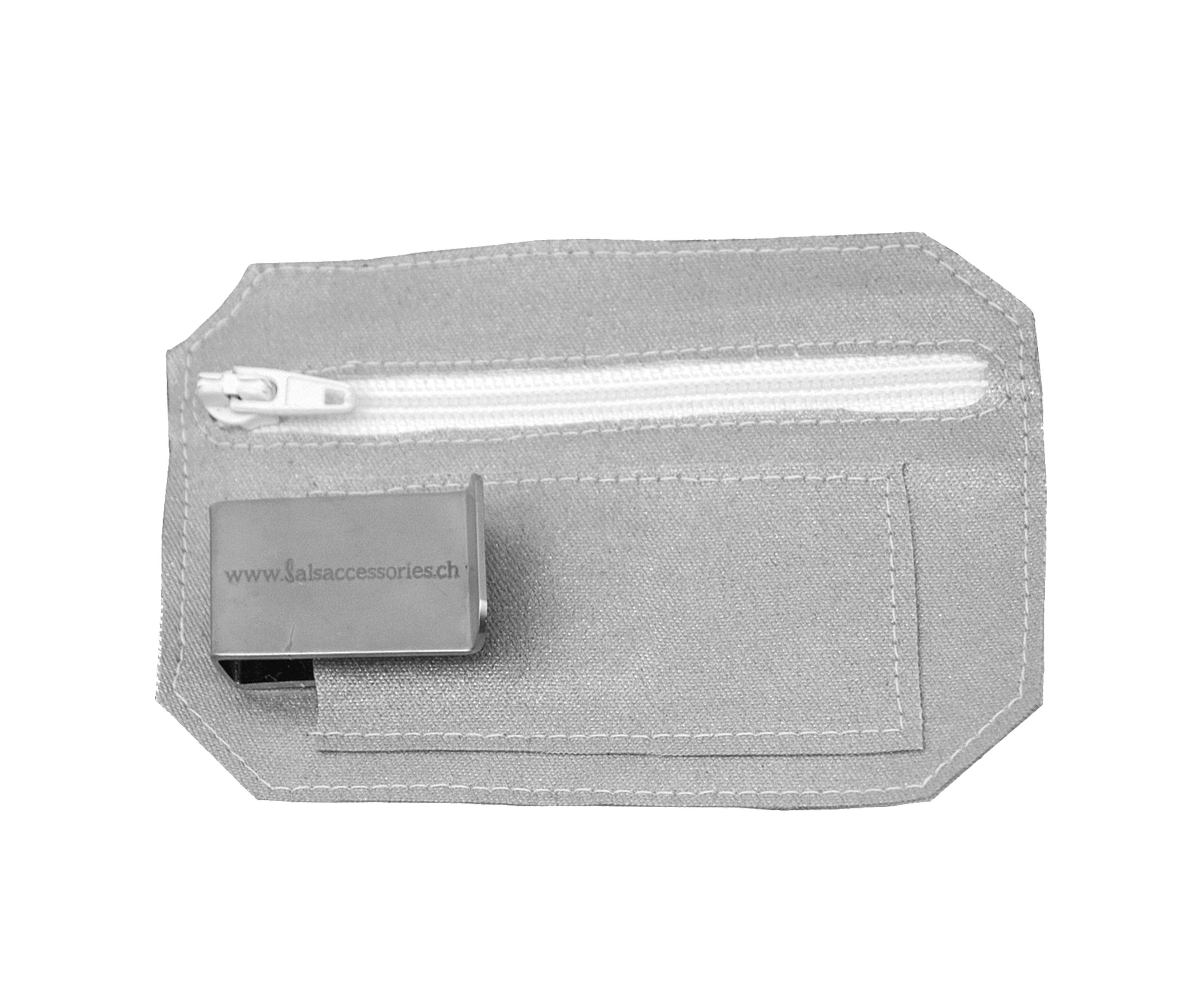 Silver sparkle. Die InvisiBags der Glam Edition von Salsaccessories sind in verschiedenen, glänzenden Farben erhältlich. Jeder InvisiBag fasst mühelos Kreditkarten, Identitätskarten, Geld und Hotel-Schlüsselkarten. Idealerweise werden nicht mehr als 3-4 Karten in den InvisiBag gepackt, um zu grossen Druck auf den Reissverschluss zu vermeiden.